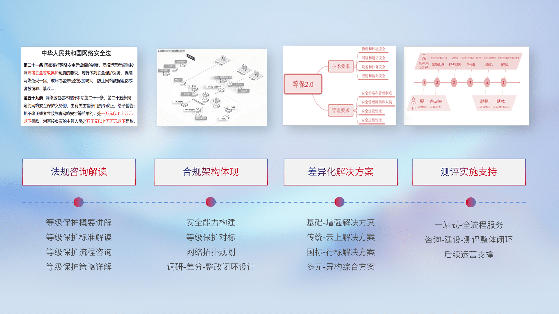 通过专业的法律咨询解读、、、、合规架构体现、、、差异化解决方案、、、测试实施支持等服务,,,,为客户量身打造等保合规体系。。